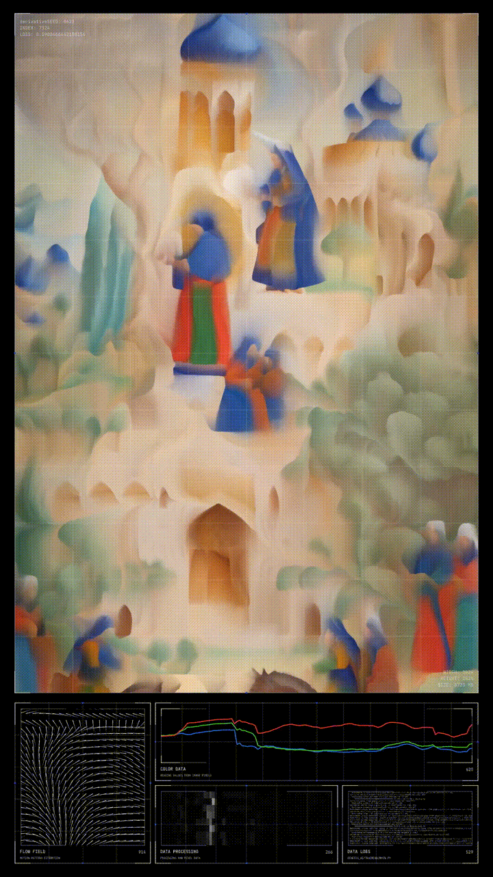 "Muraqqa: Neural Impressions" is a captivating journey through time and technology, where ancient miniature paintings come to life through the modern marvels of machine intelligence. Orkhan Mammadov, bridging his Azerbaijani heritage with his expertise in data visualisation, transforms 111 miniature masterpieces into animated 'data miniatures.' These artworks, once static windows into bygone eras, now dance with life and color, thanks to Diffusion and GAN models. Each piece, a part of a grander narrative spanning from the Mughal, Deccan, and Isfahan schools, is revitalized, allowing the intricate tales of royal life and Persian calligraphy to resonate anew. This series is not just a display of artistic finesse; it is a testament to the timeless nature of storytelling, where history is reimagined and preserved through the symphony of silicon and code, echoing the UNESCO mission of fostering cultural exchange and immortalizing our shared heritage.